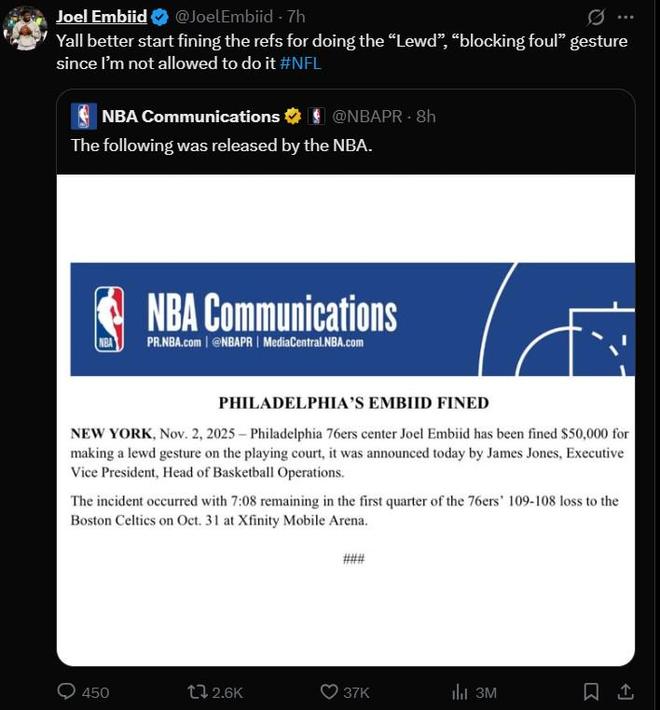 在處罰結(jié)果公布后,恩比德在社媒上轉(zhuǎn)發(fā)了官方的公告,并配文寫(xiě)道:“既然我不被允許做那個(gè)‘猥褻’或‘阻擋犯規(guī)’的手勢(shì),你們最好開(kāi)始對(duì)裁判進(jìn)行罰款。”